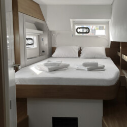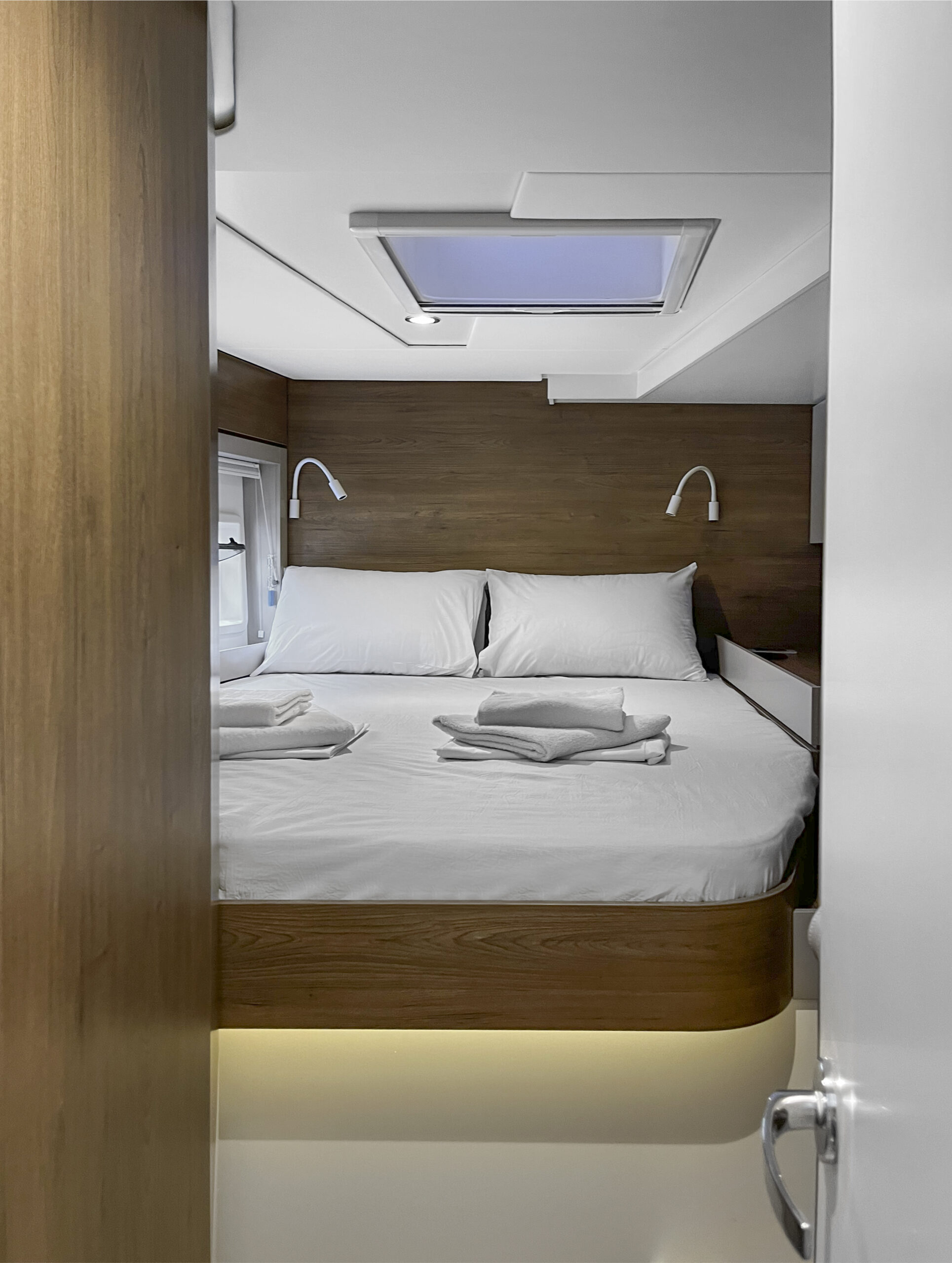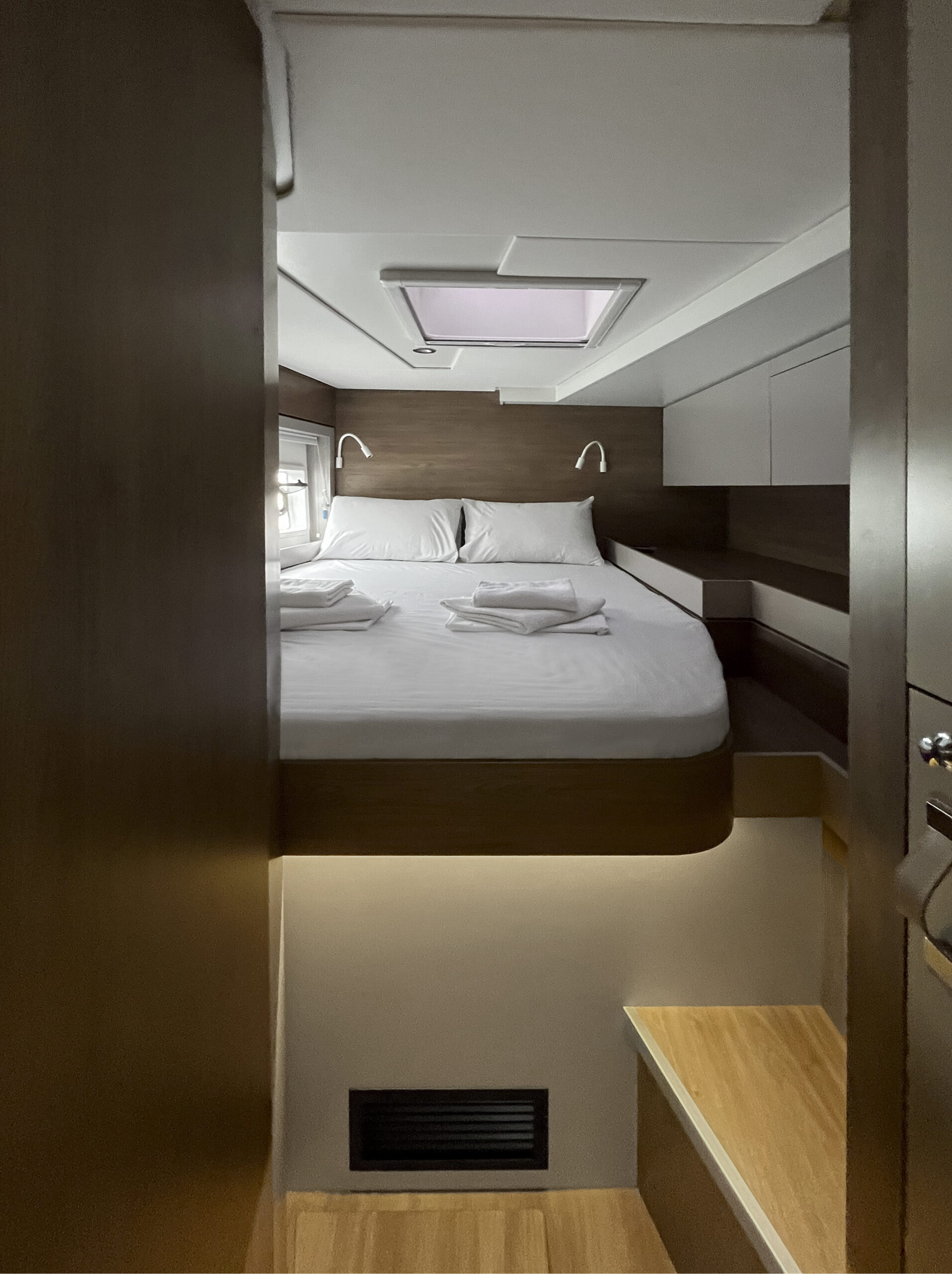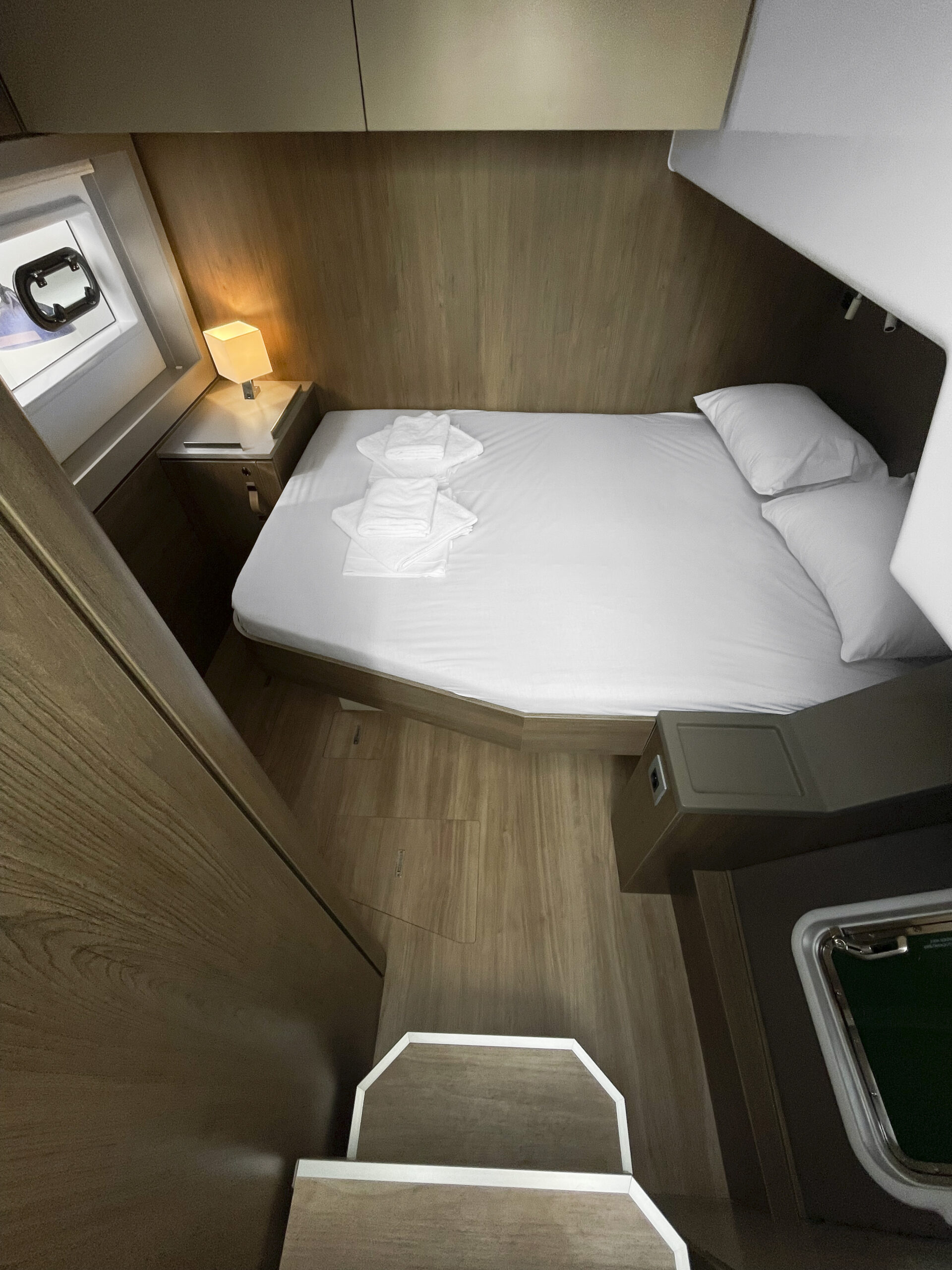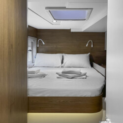 Bali 4.6 built in 2023, has four double cabins, one bunkbed with 2 single beds and two single cabins outside for the crew, four bathrooms and one smaller bathroom for the crew outside and saloon can turn in to a double bed. Can accommodate up to 12 guests