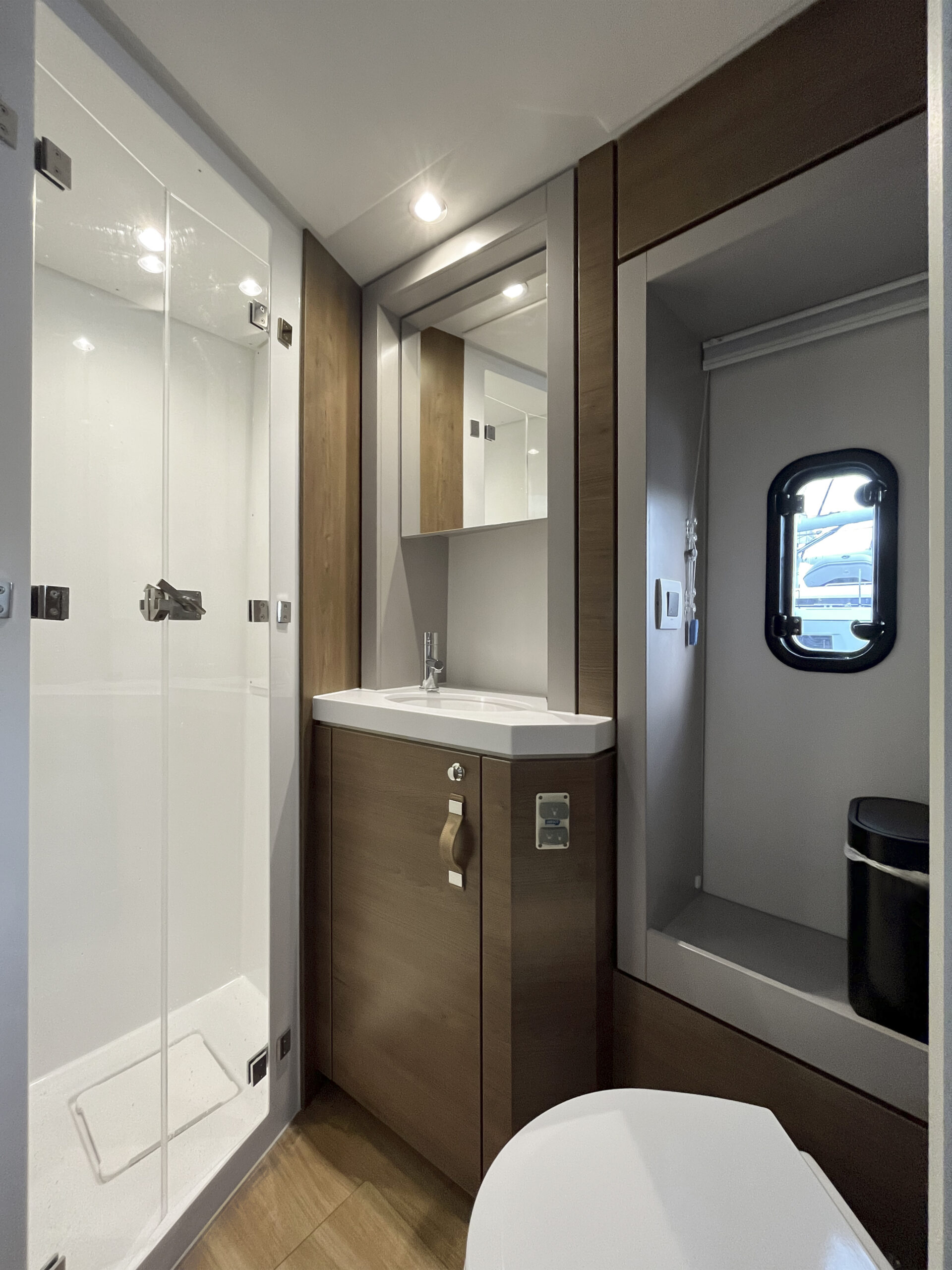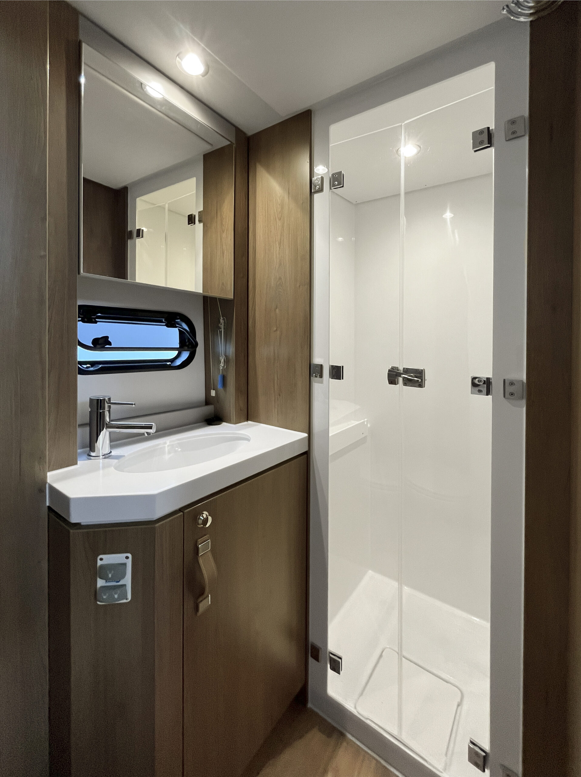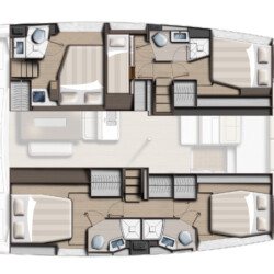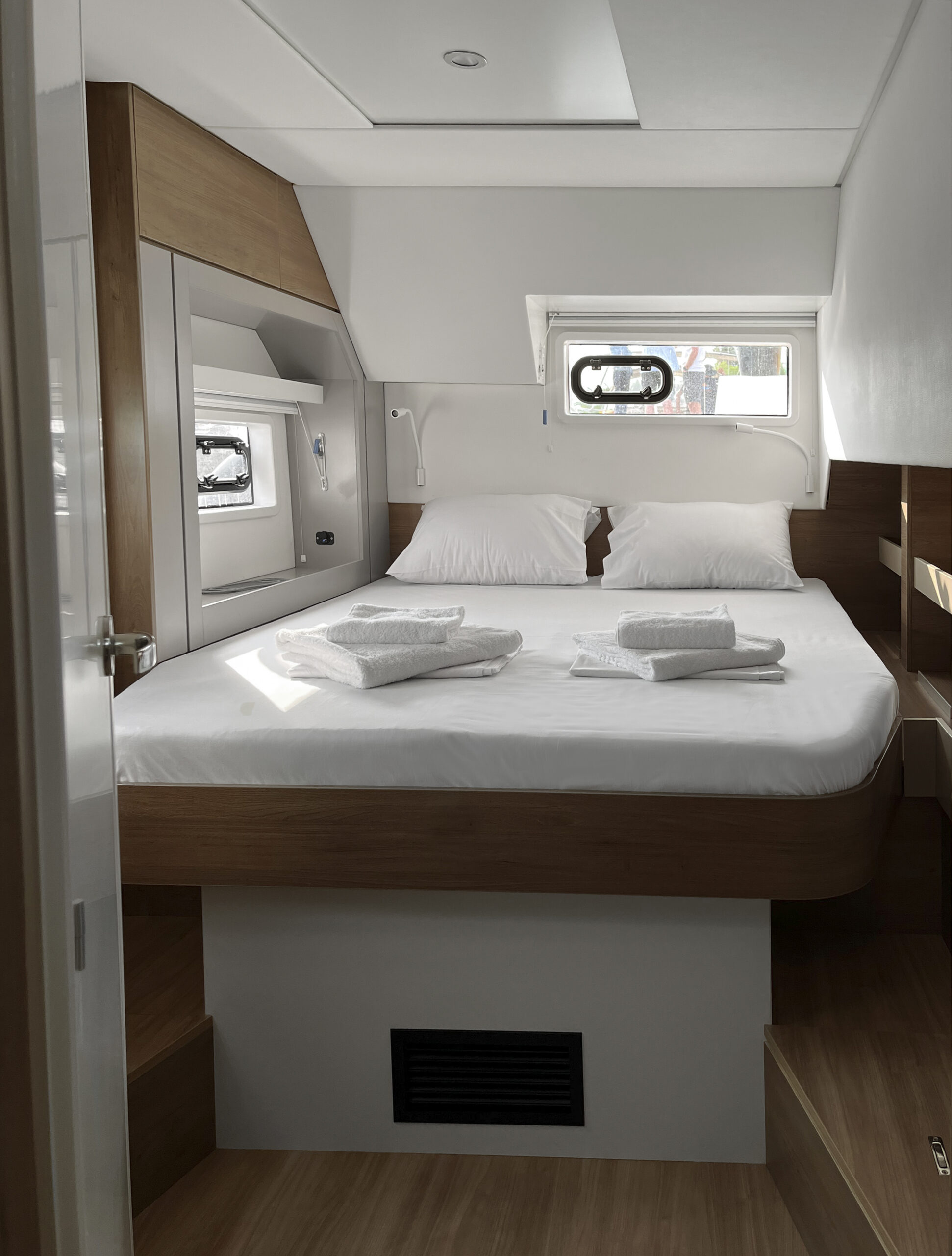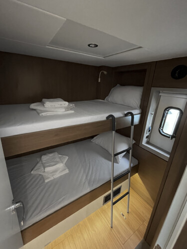 Bali 4.6 built in 2023, has four double cabins, one bunkbed with 2 single beds and two single cabins outside for the crew, four bathrooms and one smaller bathroom for the crew outside and saloon can turn in to a double bed. Can accommodate up to 12 guests